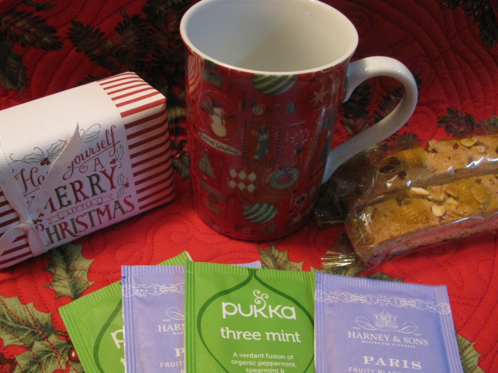 Thank you so much Rosemary!  I sampled the three mint tea (in my new holiday cup) and  a piece of biscotti before bed last night.  Yum!  I can hardly wait to soak in a tub with the wonderful Rosemary (How appropriate!!!) and mint soap.
